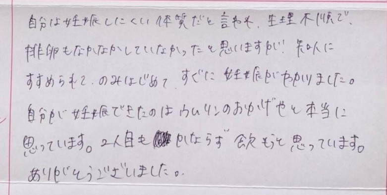 ウムリンのおかげやと本当に思っています。2人目もかならず飲もうと思っています。ありがとうございました。