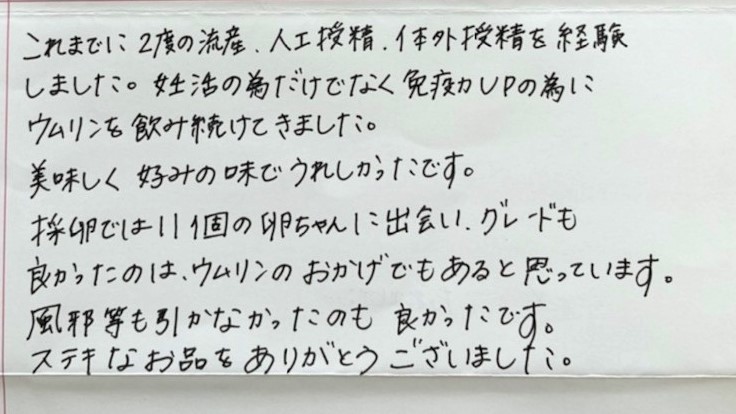 美味しく好みの味でうれしかったです。ウムリンのおかげでもあると思っています。風邪等も引かなかったのも良かったです。ステキなお品をありがとうございました。