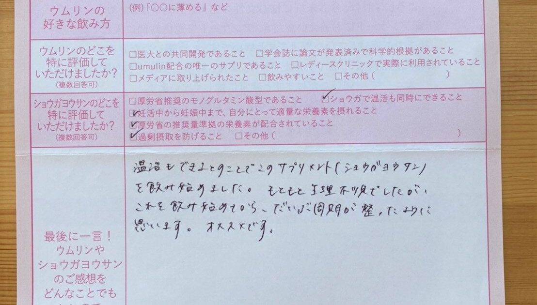 温活もできるとのことでこのサプリメント(ショウガヨウサン)を飲み始めました。これを飲み始めてから、だいぶ周期が整ったように思います。オススメです。