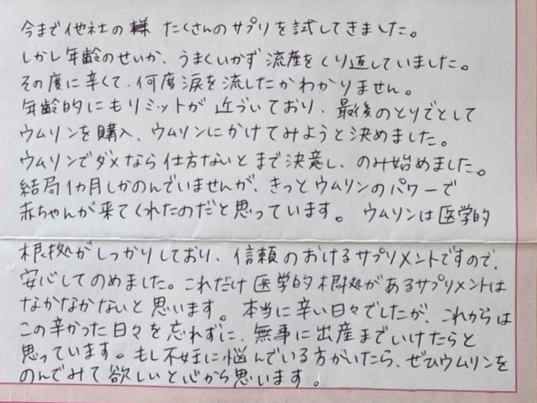 今まで他社のたくさんのサプリを試してきました。しかし年齢のせいか、うまくいかずその度に辛くて、何度涙を流したかわかりません。年齢的にもリミットが近づいており、最後のとりでとしてウムリンを購入、ウムリンにかけてみようと決めました。ウムリンでダメなら仕方ないとまで決意し、のみ始めました。結局1ヶ月しかのんでいませんが、きっとウムリンのパワーで来てくれたのだと思っています。ウムリンは医学的根拠がしっかりしており、信頼のおけるサプリメントですので、安心してのめました。これだけ医学的根拠処があるサプリメントはなかなかないと思います。本当に辛い日々でしたが、これからはこの辛かった日々を忘れずに、無事にいけたらと思っています。もし悩んでいる方がいたら、ぜひウムリンをのんでみて欲しいと心から思います。
