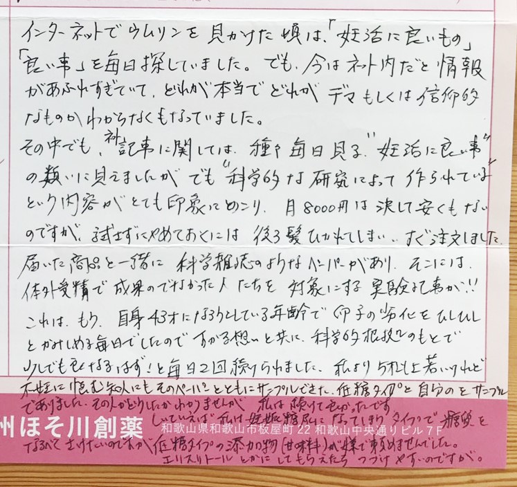 今はネット内だと情報があふれすぎていて、どれが本当でどれがデマもしくは信仰的なものかわからなくもなっていました。”科学的な研究によって作られている”という内容がとても印象にのこり、月8000円は決して安くもないのですが、試さずにやめておくには後ろ髪ひかれてしまい…すぐ注文しました。すがる想いと共に、科学的根拠のもとで少しでも良くなるはず!と毎日2回続けられました。私は続けて良かったです。