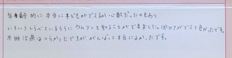 年齢的に本当に子どもができるか心配だったのもあり、いろいろしらべているうちにウムリンを知ることができました。がんばって本当によかったです。