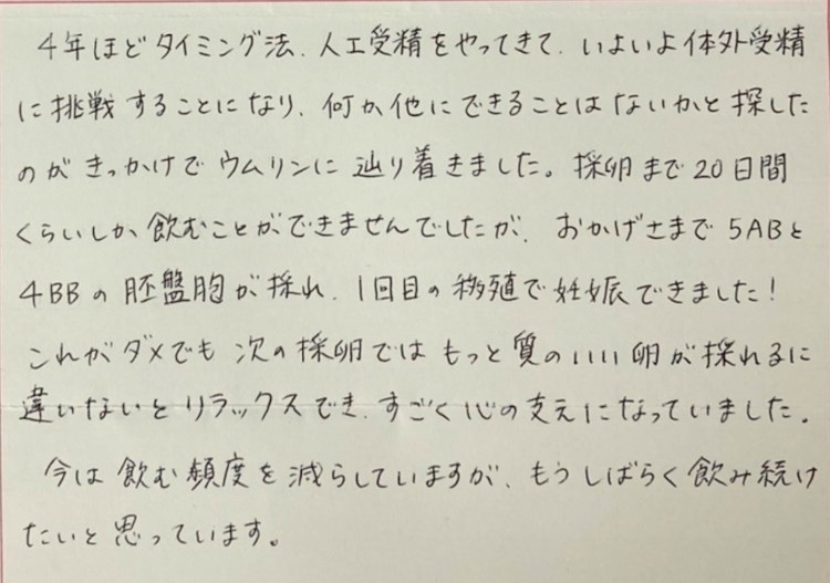 何か他にできることはないかと探したのがきっかけでウムリンに辿り着きました。リラックスでき、すごく心の支えになっていました。今は飲む頻度を減らしていますが、もうしばらく飲み続けたいと思っています。