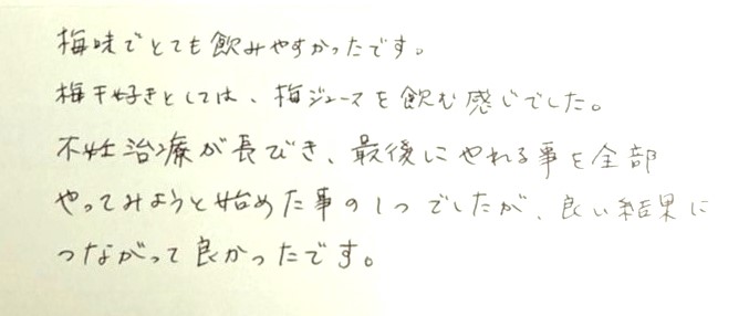 梅味でとても飲みやすかったです。梅干好きとしては、梅ジュースを飲む感じでした。最後にやれる事を全部やってみようと始めた事の1つでしたが、良い結果につながって良かったです。