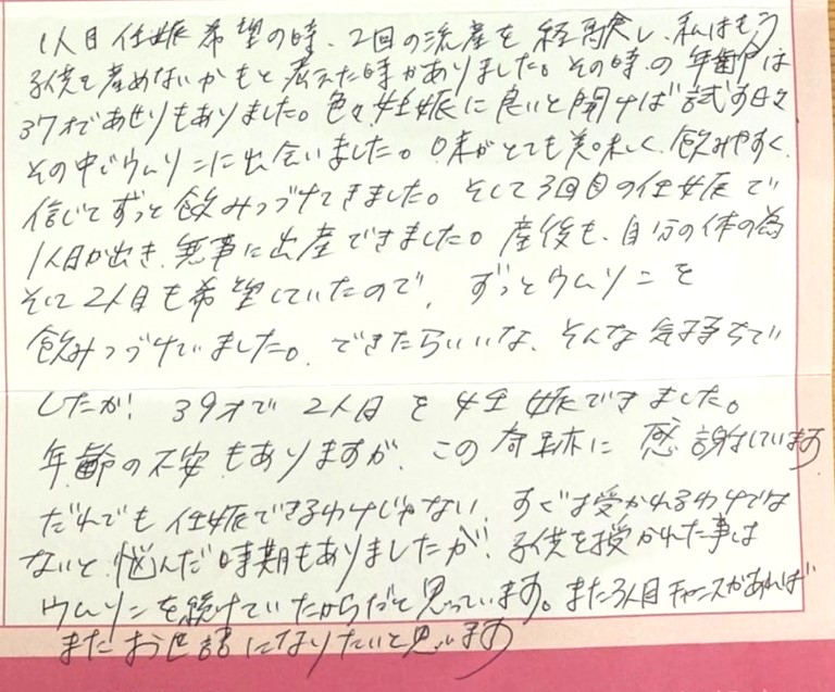 その中でウムリンに出会いました。味がとても美味しく、飲みやすく、信じてずっと飲みつづけてきました。年齢の不安もありますが、この奇跡に感謝しています。またチャンスがあればまたお世話になりたいと思います。