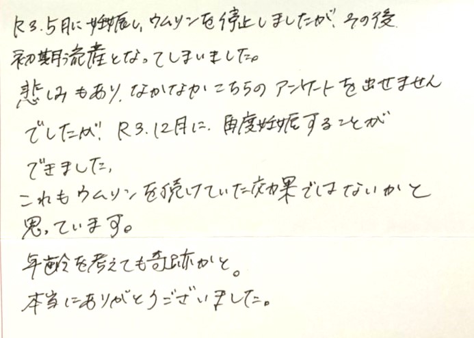 これもウムリンを続けていた効果ではないかと思っています。年齢を考えても奇跡かと。本当にありがとうございました。