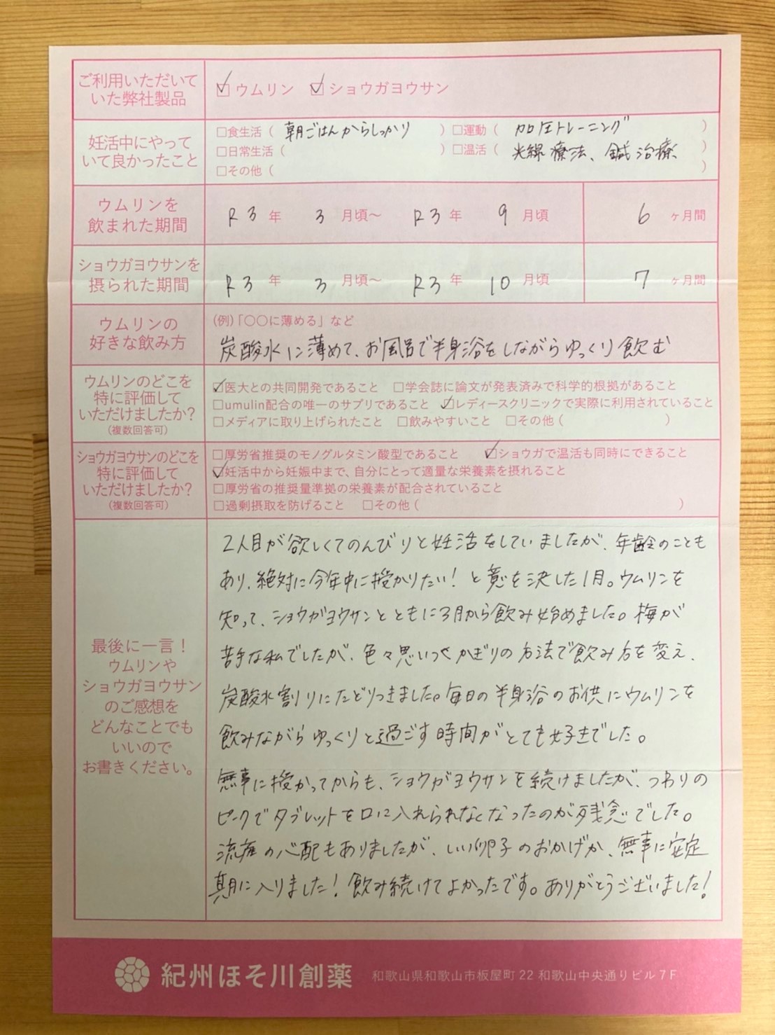 ウムリンを知って、ショウガヨウサンとともに3月から飲み始めました。梅が苦手な私でしたが、色々思いつくかぎりの方法で飲み方を変え、炭酸水割りにたどりつきました。毎日の半身浴のお供にウムリンを飲みながらゆっくりと過ごす時間がとても好きでした。飲み続けてよかったです。ありがとうございました!