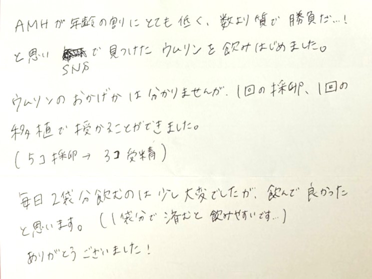 数より質で勝負だ…!と思いSNSで見つけたウムリンを飲みはじめました。毎日2袋分飲むのは少し大変でしたが、飲んで良かったと思います。(1袋分で済むと飲みやすいです…)ありがとうございました!