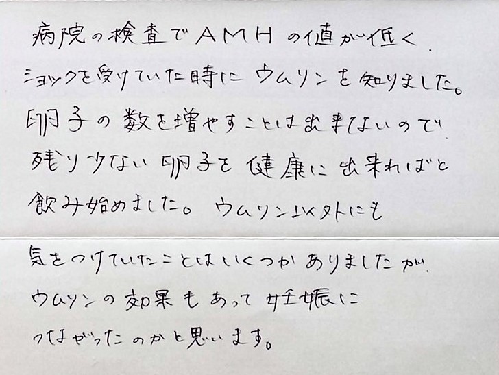 病院の検査でAMHの値が低くショックを受けていた時にウムリンを知りました。数を増やすことは出来ないので健康に出来ればと飲み始めました。
