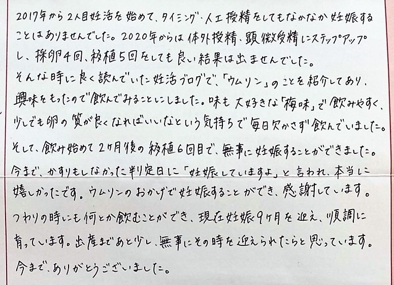ブログで、「ウムリン」のことを紹介してあり、興味をもったので飲んでみることにしました。味も大好きな「梅味」で飲みやすく、毎日欠かさず飲んでいました。感謝しています。今まで、ありがとうございました。