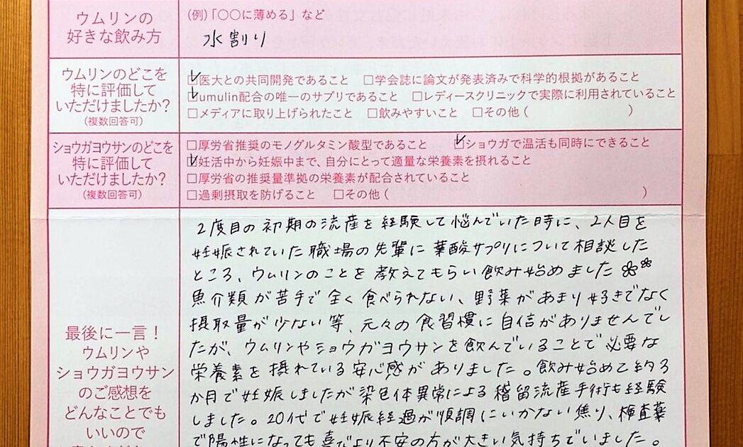 今度は後悔しないようできることはやっておこうと思い色々ネットで調べてウムリンを飲むようになりました。ウムリンに加えて他社さんのものですが、葉酸サプリも毎日飲んでYouTubeでヨガをしたり、少しですが運動もするようにしま […]
