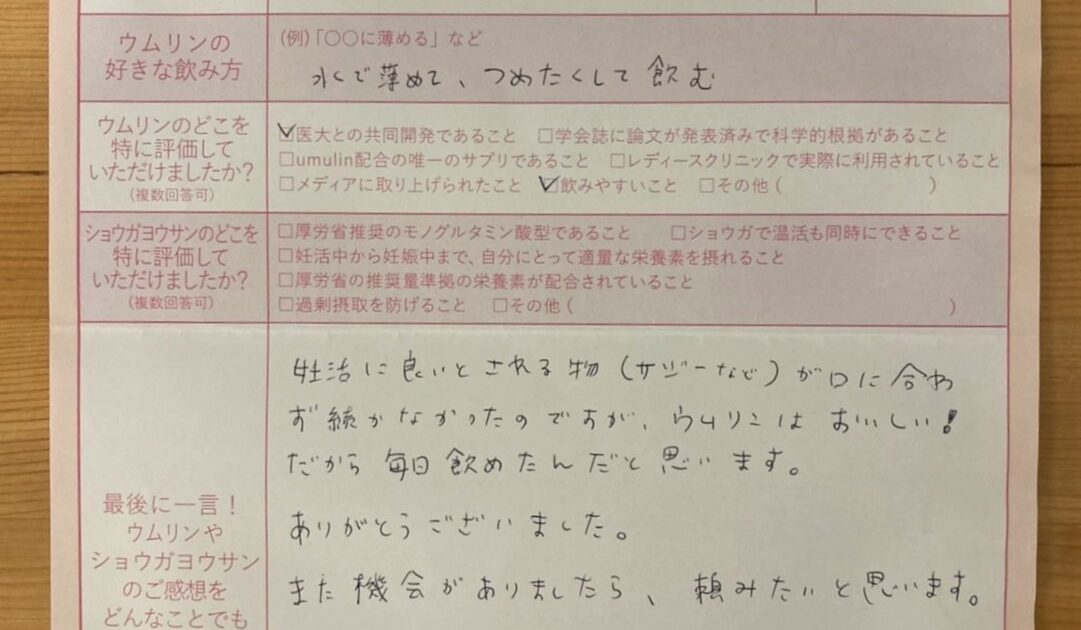 ウムリンはおいしい!だから毎日飲めたんだと思います。ありがとうございました。また機会がありましたら、頼みたいと思います。