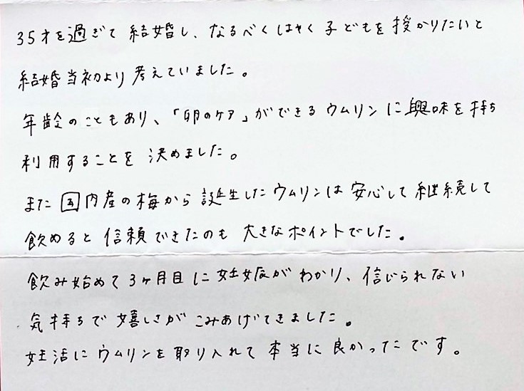 ウムリンに興味を持ち利用することを決めました。国内産の梅から誕生したウムリンは安心して継続して飲めると信頼できたのも大きなポイントでした。ウムリンを取り入れて本当に良かったです。