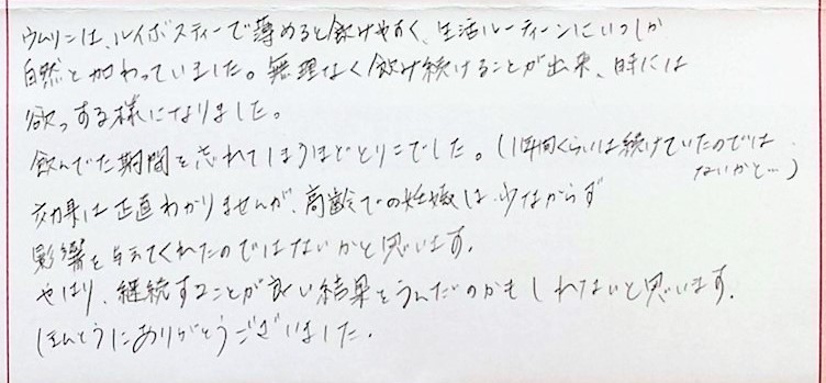 ウムリンは、ルイボスティーで薄めると飲みやすく、生活ルーティーンにいつしか自然と加わっていました。無理なく飲み続けることが出来、時には欲っする様になりました。飲んでた期間を忘れてしまうほどとりこでした。(1年間くらいは続けていたのではないかと…)やはり継続することが良い結果をうんだのかもしれないと思います。ほんとうにありがとうございました。