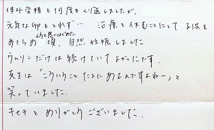 治療を休むことにして子供をあきらめようと思いはじめた頃、成功しました。ウムリンだけは続けていてよかったです。先生は「こういうことたまにあるんですよね~」と笑っていました。キセキをありがとうございました。