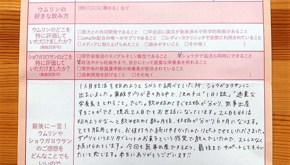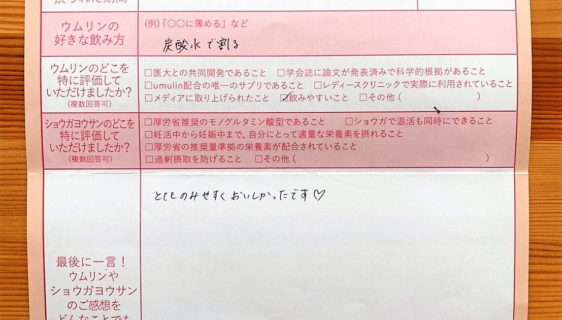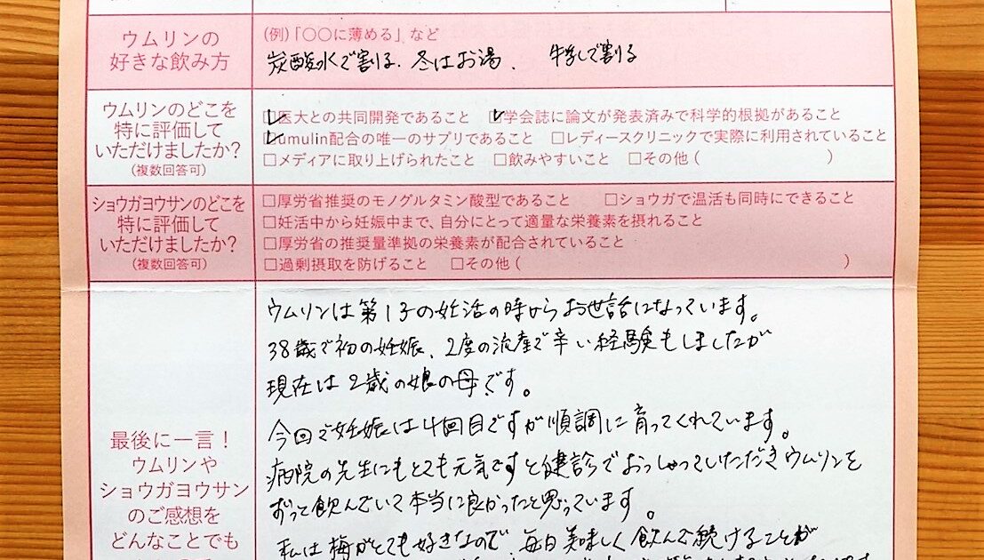 ウムリンもショウガヨウサンもおいしくて、毎日欠かさず 続けることができました。不妊検査や治療などで一喜一憂する事もありましたが、ウムリンに同封されている楽しい情報やメッセージが励みになりました。これからも飲み続けたいと思 […]