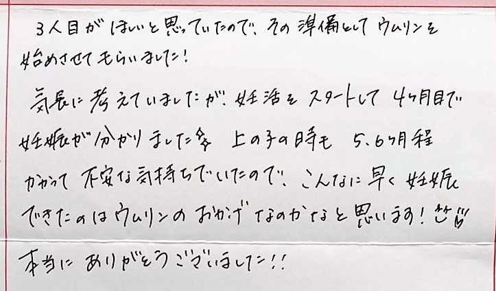 3人目がほしいと思っていたので、その準備としてウムリンを始めさせてもらいました!気長に考えていましたが、妊活をスタートして4ヶ月目で分かりました✨本当にありがとうございました!!