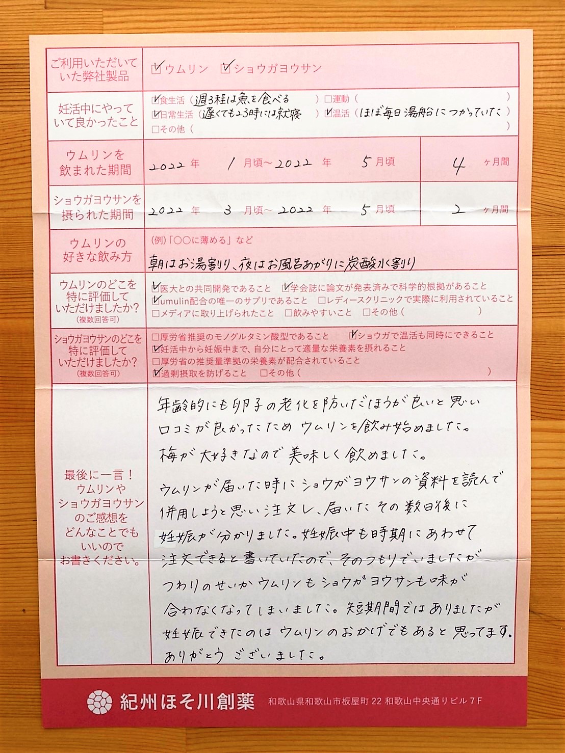 年齢的にも防いだほうが良いと思いウムリンを飲み始めました。梅が大好きなので美味しく飲めました。ウムリンが届いた時にショウガヨウウサンの資料を読んで併用しようと思い注文し、届いたその数日後に分かりました。つわりのせいかウムリンもショウガヨウサンも味が合わなくなってしまいました。短期間ではありましたが ありがとうございました。