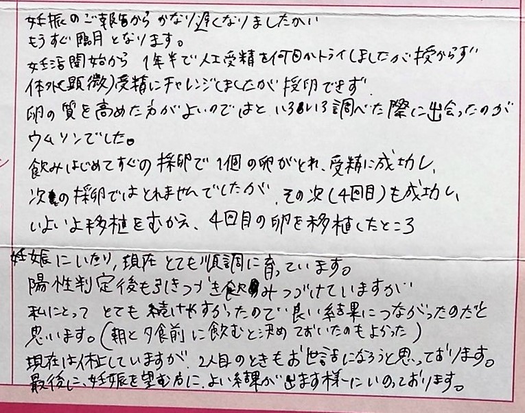 いろいろ調べた際に出会ったのが ウムリンでした。私にとってとても続けやすかったので良い結果につながったのだと思います。(朝と夕食前に飲むと決めておいたのもよかった)現在は休止していますが、2人目のときもお世話になろうと思っております。最後に、妊娠を望む方に、よい結果が出ます様にいのっております。