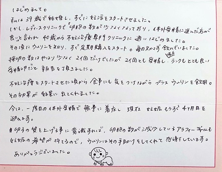 はじめまして。ウムリンを知り、すぐ定期購入をスタート。毎日欠かさず飲んでいました。食事にも気をつけながらプラスウムリンを飲用。感謝しています。ありがとうございました。