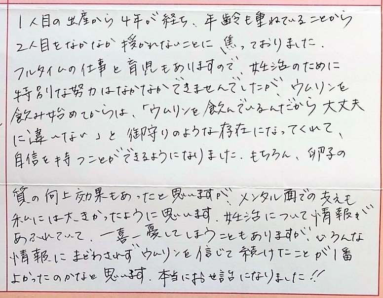 フルタイムの仕事と育児もありますので、特別な努力はなかなかできませんでしたが、ウムリンを飲み始めてからは、御守りのような存在になってくれて、自信を持つことができるようになりました。メンタル面での支えも私には大きかったように思います。情報があふれていて、一喜一憂してしまうこともありますが、いろんな情報にまどわされず、続けたことが1番よかったのかなと思います。本当にお世話になりました!!