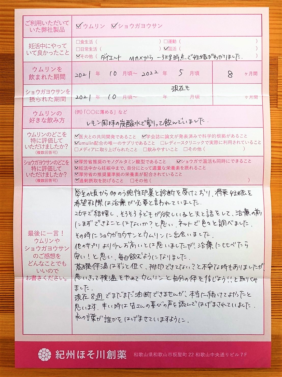 26才で結婚し、そろそろ欲しいねと夫と話をして、ネットで色々と調べました。その時にショウガヨウサンとウムリンに出会いました。他のサプリより少しお高いとは思いましたが、毎日飲むようになりました。自分の体を信じよう!と取りくみました。本当に続けてよかったと思います。辛い時は皆さんの喜びの声を読んではげまされていました。私の言葉が誰かをはげませていますように。