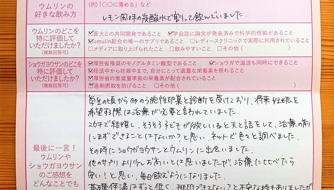 26才で結婚し、そろそろ欲しいねと夫と話をして、ネットで色々と調べました。その時にショウガヨウサンとウムリンに出会いました。他のサプリより少しお高いとは思いましたが、毎日飲むようになりました。自分の体を信じよう!と取りく […]