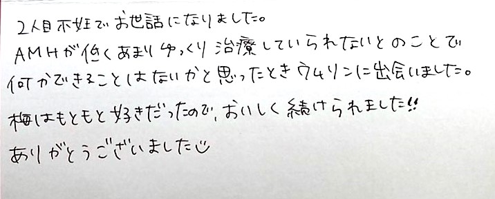 お世話になりました。何かできることはないかと思ったときウムリンに出会いました。梅はもともと好きだったので、おいしく続けられました!!ありがとうございました(・v・)
