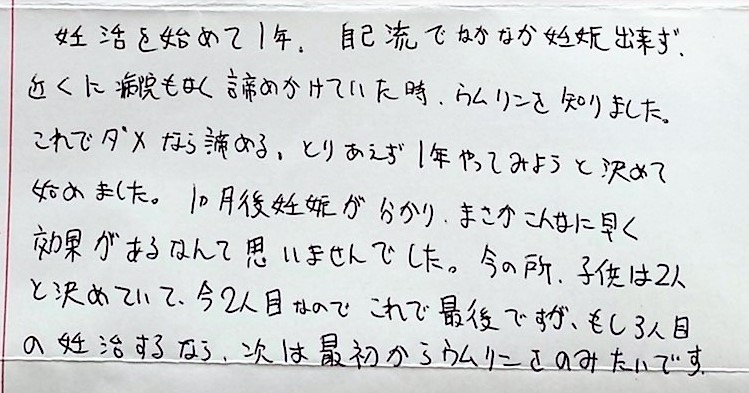 諦めかけていた時、ウムリンを知りました。これでダメなら諦める。とりあえず1年やってみようと決めて始めました。次は最初からウムリンをのみたいです。