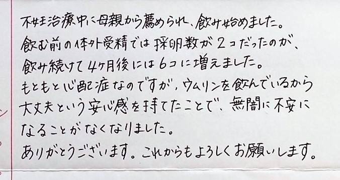 母親から薦められ、飲み始めました。もともと心配症なのですが、ウムリンを飲んでいるから大丈夫という安心感を持てたことで、無闇に不安になることがなくなりました。ありがとうございます。これからもよろしくお願いします。