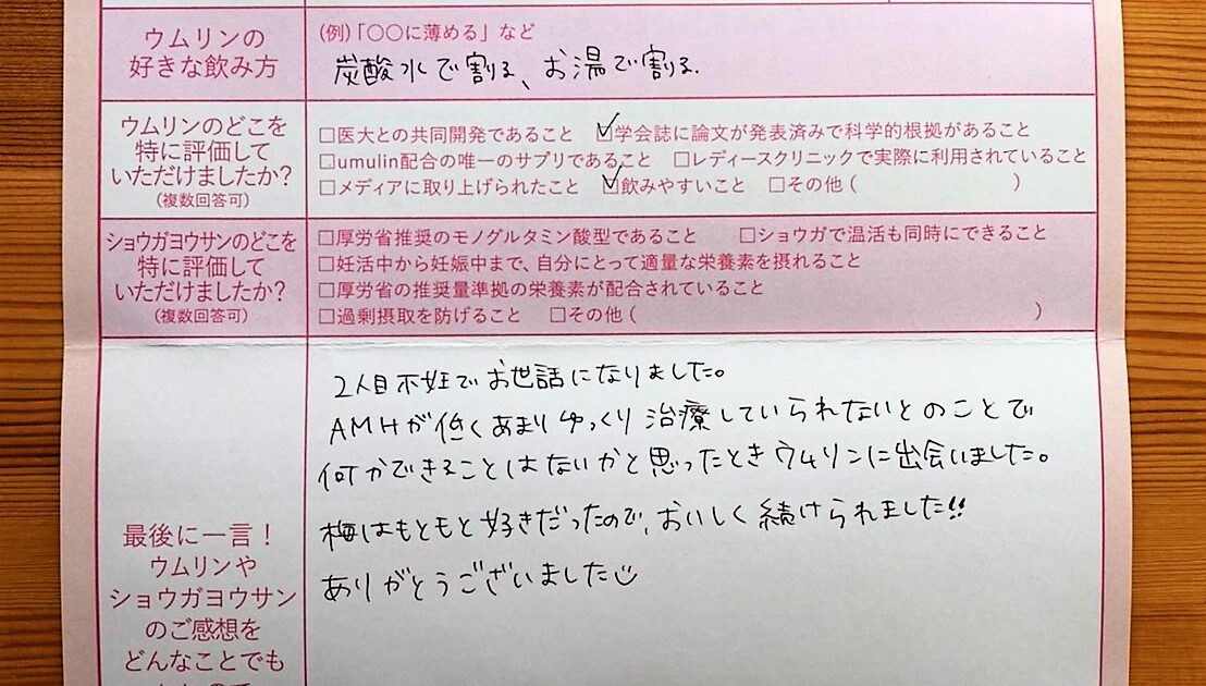 諦めかけていた時、ウムリンを知りました。これでダメなら諦める。とりあえず1年やってみようと決めて始めました。次は最初からウムリンをのみたいです。