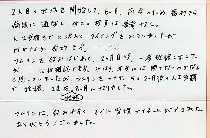 2人目の妊活を開始して、6ヶ月、高令のため最初から病院に通院し、全ての検査は異常なし。人工受精までと決めて、タイミングをみていましたが、なかなか成功せず。やはり、年令には勝てないのかなぁと思っていました。現在妊娠8ヶ月になりました。ウムリンは、飲みやすく、すぐに習慣づけることができました。ありがとうございました。