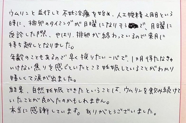 ウムリンを飲み続けていたことが良かったのかもしれません。本当に感謝しています。ありがとうございました。