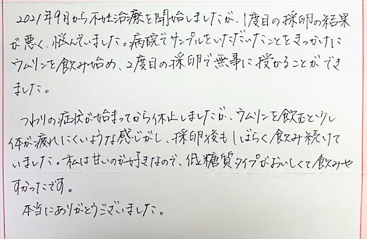 病院でサンプルをいただいたことをきっかけにウムリンを飲み始めました。私は甘いのが好きなので、低糖質タイプがおいしくて飲みやすかったです。本当にありがとうございました。
