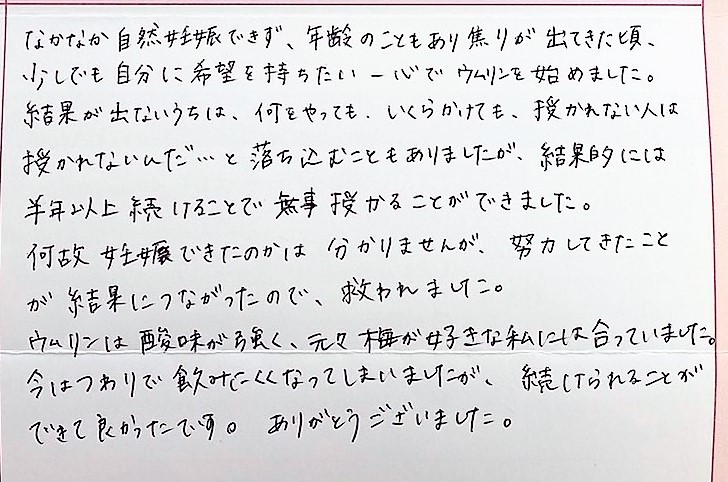 年齢のこともあり焦りが出てきた頃、少しでも自分に希望を持ちたい一心でウムリンを始めました。結果が出ないうちは、落ち込むこともありました。努力してきたことが結果につながったので、救われました。ウムリンは酸味が強く、元々梅が好きな私には合っていました。今はつわりで飲けにくくなってしまいましたが、続けられることができて良かったです。ありがとうございました。
