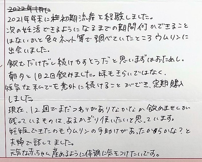 色々ネット等で調べていたところウムリンに出会いました。飲むだけだし続けやすそうだと思いまずはおためし。朝タと1日2日飲みました。味もきらいではなく、短気な私でも意外に続けることででき、定期購入しました。残っているものは、あるかぎり使いたいと思っています。
