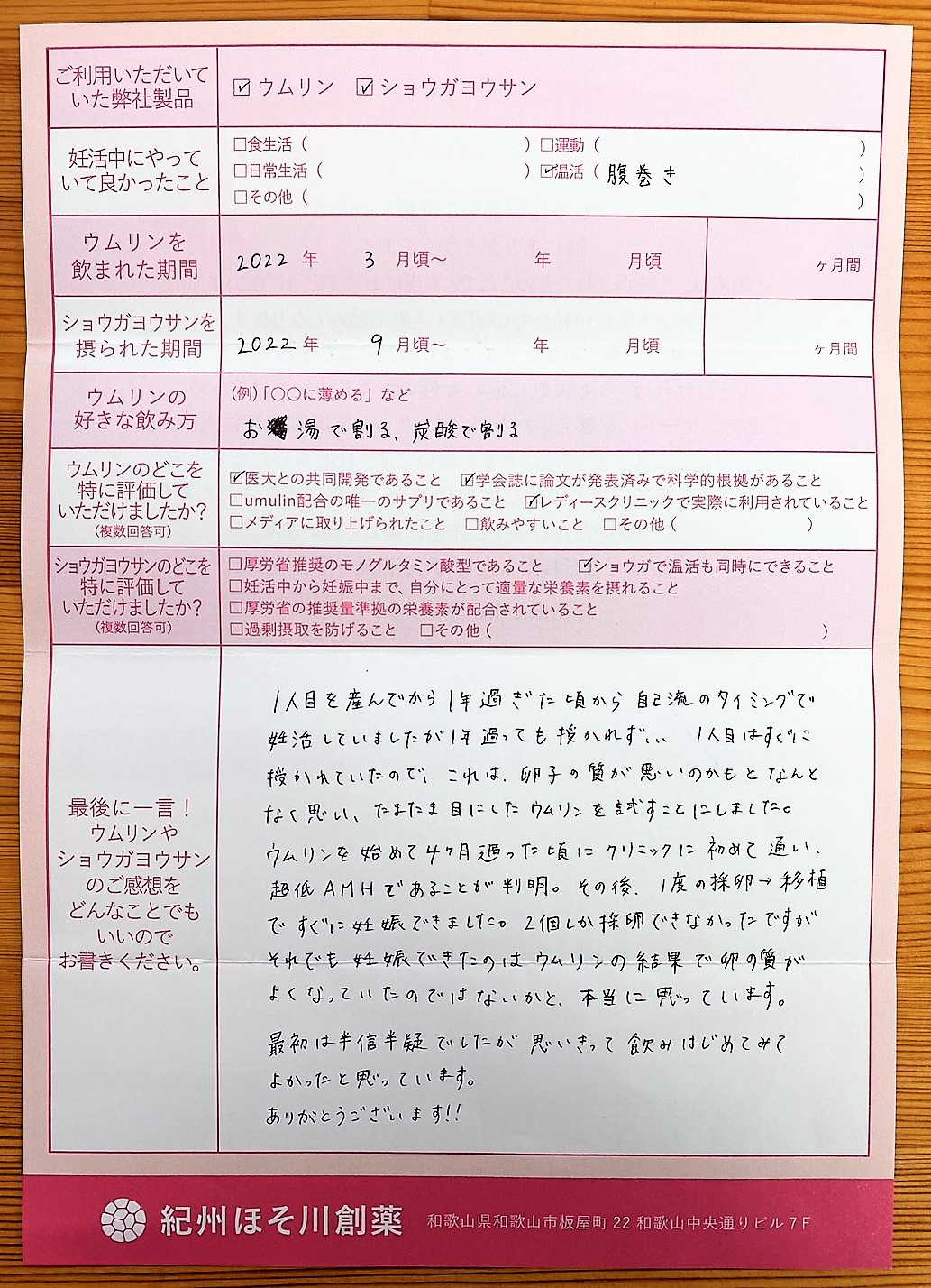 たまたま目にしたウムリンを試すことにしました。思いきって飲みはじめてみてよかったと思っています。ありがとうございます!!