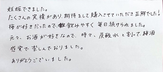 梅が好きだったので、飲みやすく毎日続けられました。元々、お酒が好きなので、時々、炭酸水と割って、梅酒感覚で楽しんでおりました。ありがとうございました。
