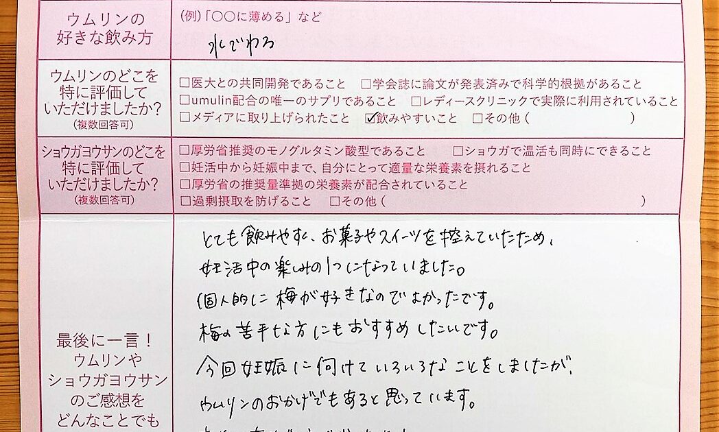 年齢のこともあり焦りが出てきた頃、少しでも自分に希望を持ちたい一心でウムリンを始めました。結果が出ないうちは、落ち込むこともありました。努力してきたことが結果につながったので、救われました。ウムリンは酸味が強く、元々梅が […]