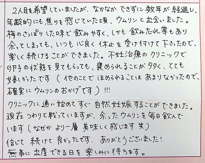 焦りを感じていた頃、ウムリンと出会いました。梅のさっぱりした味で飲みやすく、しかも飲み忘れ等もあり余ってしまっても、いつも心良く休止を受け付けて下さったので楽しく続けることができました。現在つわりと戦っていますが、余ったウムリンを毎日飲んでいます(なぜかより一層美味しく感じます笑)続けて良かったです。ありがとうございました!