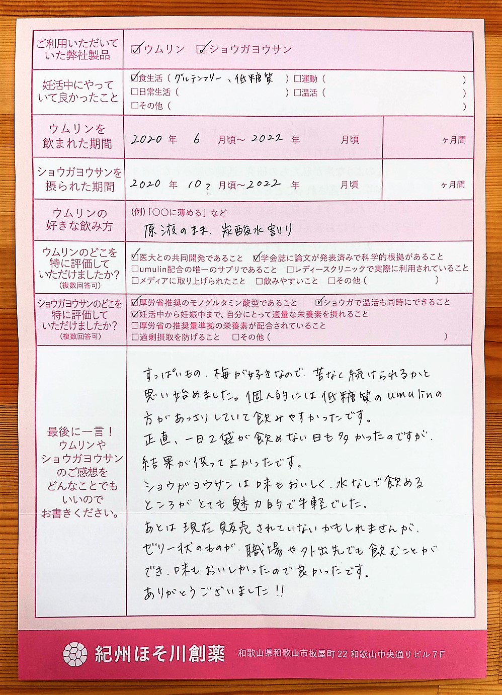 すっぱいもの・梅が好きなので、苦なく続けられるかと思い始めました。個人的には低糖質のumulinの方があっさりしていて飲みやすかったです。正直、一日2袋が飲めない日も多かったのですが、よかったです。ショウガヨウサンは味もおいしく、水なしで飲めるところがとても魅力的で手軽でした。あとは現在販売されていないかもしれませんが、ゼリー状のものが、職場や外出先でも飲むことができ、味もおいしかったので良かったです。ありがとうございました!!