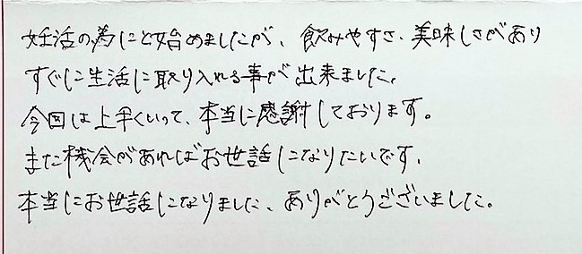 飲みやすさ、美味しさがありすぐに生活に取り入れる事が出来ました。今回は上手くいって、本当に感謝しております。また機会があればお世話になりたいです。本当にお世話になりました、ありがとうございました。