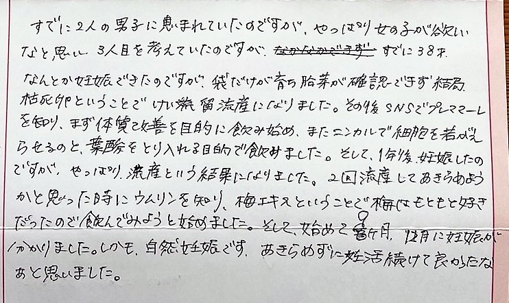 あきらめようかと思った時にウムリンを知り、梅エキスということで梅はもともと好きだったので飲んでみようと始めました。あきらめずに続けて良かったなぁと思いました。