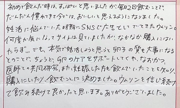 初めて飲んだ時は、すっぱいと思いましたが、毎日2回飲むことで、だんだん慣れてきて今では、おいしいと思えるようになりました。悩んでいた時期にSNSで広告としてでてきたウムリン。何度か気になってサイトは見ていましたが、なかなか購入にはいたらず…でも、購入にいたり、飲むことに決めました。ウムリンを信じ続けて飲み続けて良かったと思います。ありがとうございました。