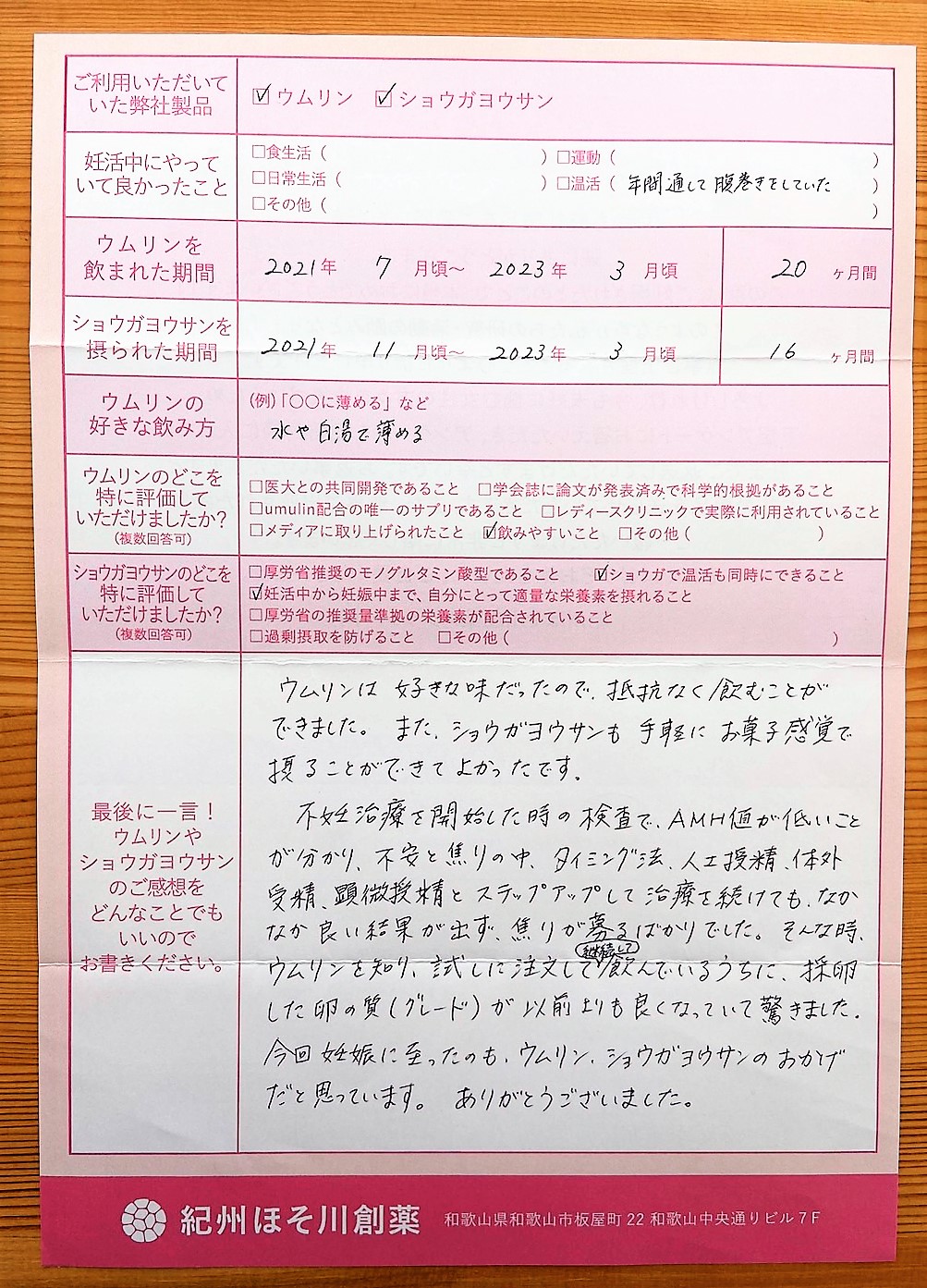 ウムリンは好きな味だったので、抵抗なく飲むことができました。また、ショウガヨウサンも手軽にお菓子感覚で摂ることができてよかったです。焦りが募るばかりでした。ありがとうございました。