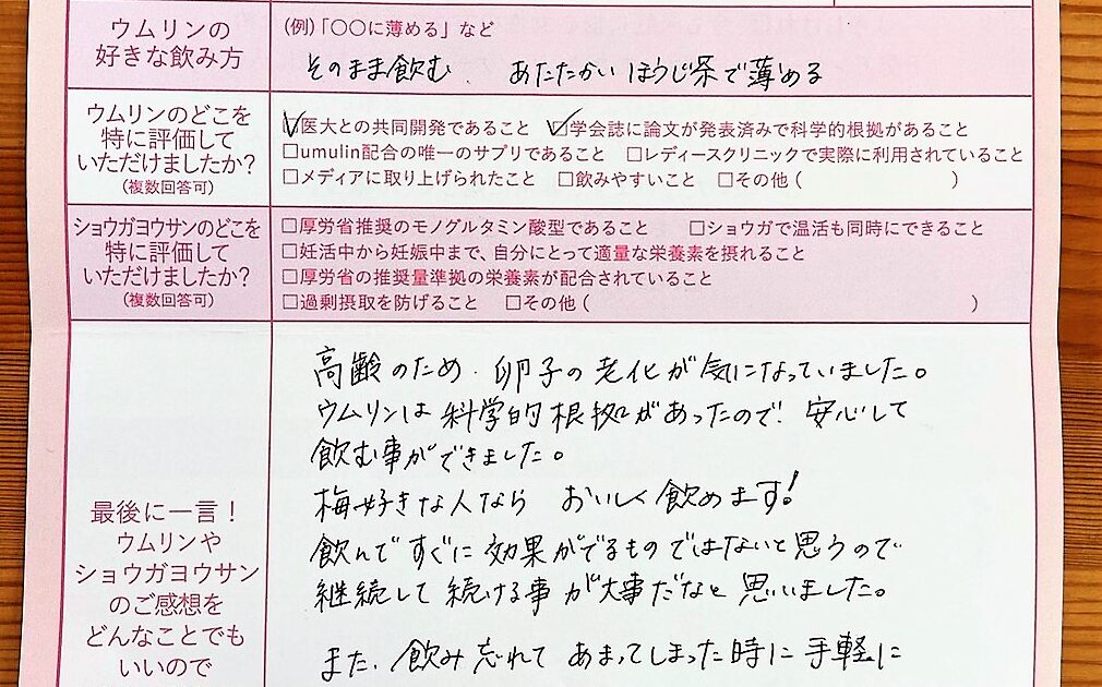 ウムリンの存在を知りました。毎日欠かさずウムリンを飲む生活を続けました。産後も疲れた時はウムリンを飲むと疲れが和らぐような感じがします。ウムリンには感謝しかありません!!また利用させて頂こうと思います。ありがとうございま […]