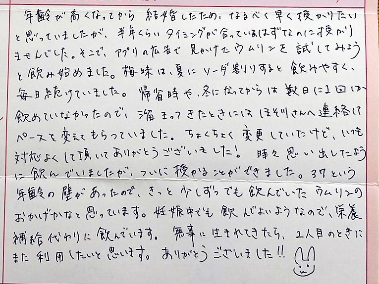 アプリの広告で見かけたウムリンを試してみようと飲み始めました。梅味は、夏にソーダ割りすると飲みやすく、毎日続けていました。帰省時や、冬になってからは数日に1回は飲めていなかったので、溜まってきたときにはほそ川さんへ連絡してペースを変えてもらっていました。ちょくちょく変更していたけど、いつも対応よくして頂いてありがとうございました。時々思い出したように飲んでいました。ありがとうございました!!