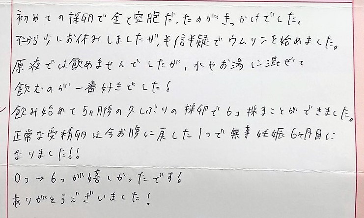 半信半疑でウムリンを始めました。原液では飲めませんでしたが、水やお湯に混ぜて飲むのが一番好きでした!ありがとうございました!