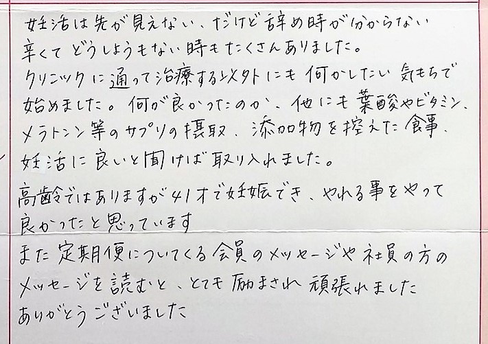 辛くてどうしようもない時もたくさんありました。何かしたい気もちで始めました。やれる事をやって良かったと思っています。また定期便についてくる会員のメッセージや社員の方のメッセージを読むと、とても励まされ頑張れました。ありがとうございました