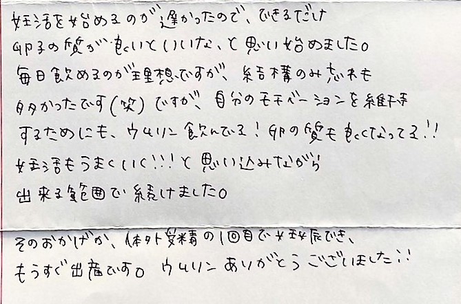 始めるのが遅かったので、できるだけ良いといいな、と思い始めました。毎日飲めるのが理想ですが、結構のみ忘れも多かったです(笑)ですが、自分のモチベーションを維持するためにも、ウムリン飲んでる!と思い込みながら出来る範囲で続けました。ウムリンありがとうございした!!
